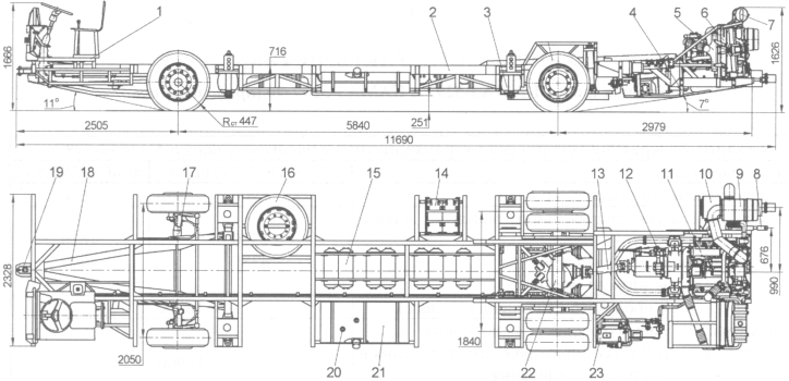 КАМАЗ; 12 — коробка передач с тросовым приводом; 13 — карданная передача; 14 — АКБ; 15 — ресиверы; 16 — запасное колесо; 17 — передняя ось; 18 — передняя подвеска; 20 — топливозаборник с подогревом; 21 — топливный бак; 22 — задний мост; 23 — установка подогревателя