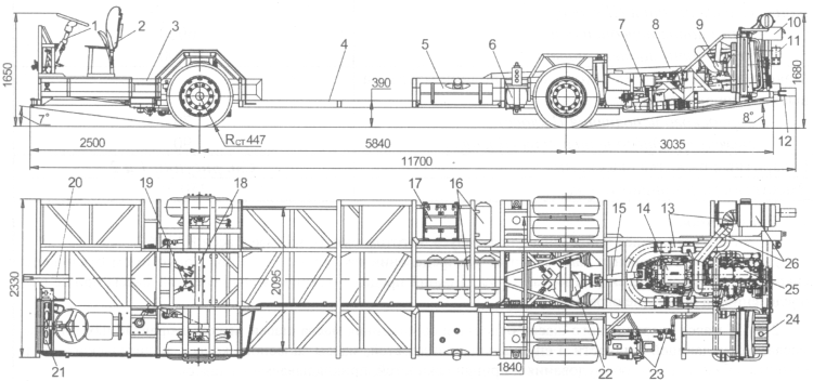 Рисунок 1, а — Габаритные размеры шасси КАМАЗ-5297-90 {полунизкопольное, с двигателем ф. “CUMMINS” и ГМП ф. “VOITH”): 1 — рулевое управление; 2 — сиденье водителя; 3, 4, 8 — модули каркаса шасси; 5 — топливный бак; 6 — задняя подвеска; 7 — шумозащитный экран; 9 — установка системы газотурбинного наддува и ОНВ; 10 — установка щитка дистанционным управлением двигателем; 11 — бачок насоса ГУР; 12, 20 — кронштейны под буксирные устройства; 13 — установка системы выпуска отработавших газов; 14 — ГМП; 15 — карданная передача; 16 — ресиверы; 17 — АКБ; 18 — передняя ось; 19 — передняя подвеска; 21 — щиток приборов; 22 — задний мост; 23 — установка подогревателя; 24 — установка системы охлаждения; 25 — двигатель ф. “CUMMINS»‘, 26 — установка системы питания двигателя воздухом