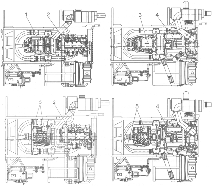 Рисунок 2 — Варианты исполнения шасси КАМАЗ-5297 и КАМАЗ-5297-90 (с двигателями EURO 3): 1 — АКП “ZF-ECOMAT” (или ГМП ф. “VOITH”); 2 — двигатель ф. “CUMMINS”; 3 — ГМП фирмы “VOITH” (или АКП “ZF-ECOMAT”); 4 — двигатель мод. КАМАЗ (EURO 3); 5 — коробка передач мод. “6S-1200 ВО” (фирмы “ZF”) с тросовым приводом; остальное — см. рисунки 1