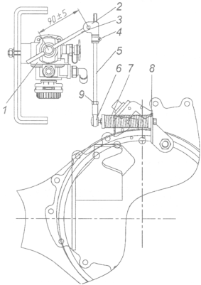 Подняв наконечник упругого элемента на величину статического прогиба подвески, равную 40 мм, убедиться, что давление в тормозных камерах задней тележки при полностью нажатой педали тормоза стало равно контрольному давлению, т.е. 588,4-637,5 кПа (6-6,5 кгс/см2); если этого не происходит, откорректировать длины рычага 3 и тяги 5. При этом помнить, что тяга должна входить в соединительную муфту регулятора на глубину не менее 45 мм. Окончательно закрепить все соединения.