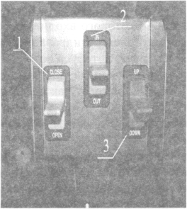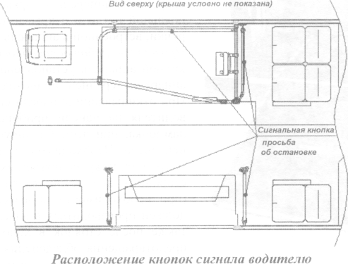 Кнопки управления подъемником из салона автобуса: 1 — кнопка открывания и закрывания двери автобуса (где непосредственно установлен подъемник); 2 — кнопка для раскладывания и складывания платформы подъемника; 3 — кнопка опускания и поднятия платформы подъемника.