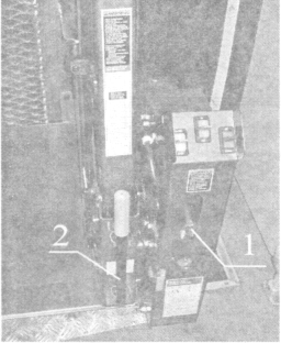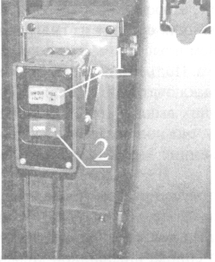 Ручное управление: 1 — рычаг для ручного управления подъемником; 2 — место установки рычага для ручного управления подъемником