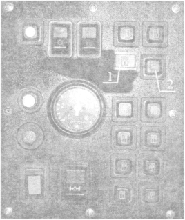 Сигнальная кнопка и кнопка включения питания: 1 — сигнальная лампа, сигнализирующая, что на подъемник подано питание; 2 — кнопка включения и выключения питания подъемника