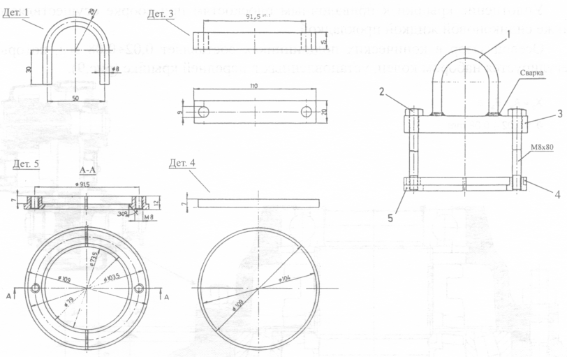Рис. 8 Приспособление для демонтажа промежуточного вала: 1 — скоба, 2 — два болта М8х80 мм, 3 — планка, 4 — фиксирующее кольцо, 5 -полукольцо