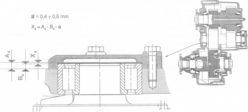 Наружные кольца подшипников удерживаются в расточках картера и крышки раздаточной коробки специальными крышками. Крышка со стороны корпуса состоит из корпуса и плоской пластины. Поэтому ее уплотнение осуществляется жидкой прокладкой в двух местах. Внутренние кольца подшипников имеют по одному буртику, напрессованы на вал буртом кольца к соответствующим шестерням. В расточке передней крышки устанавливают регулировочные кольца. Осевой зазор в подшипниках составляет 0,4-0,6 мм. Пакет регулировочных колец — Х4 определяют согласно замерам рис.6, при установленной задней крышке и положении картера коробки соответствующему горизонтальному положению привалочной плоскости (вертикальном положении валов).