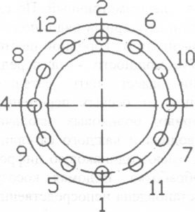 Затяжка двенадцати болтов M11x1,25 соединения корпуса водила с фланцем к ведомой косозубой шестерни выходного вала ведется в определенной последовательности (рис. 14) по правилу: момент плюс угол 90°.