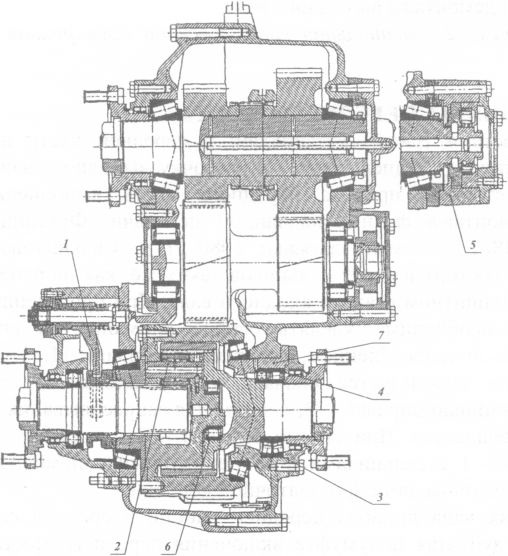 Рис. 12 Общий вид раздаточной коробки VG-1600: 1 — вилка включения блокировки дифференциала, 2 — межосевой дифференциал, 3 — сферический подшипник, 4 — цилиндрический роликовый подшипник, 5 — корпус масляного насоса, 6 — цилиндрический подшипник, 7 — стакан