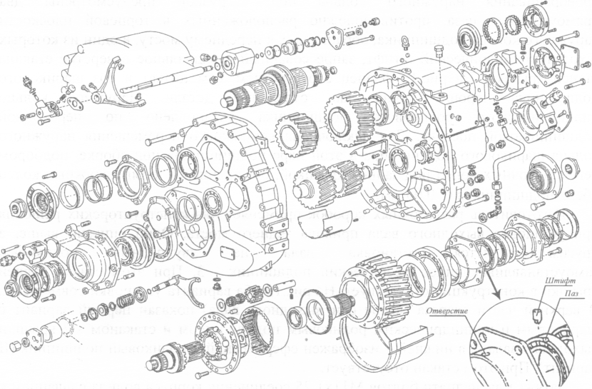 Особенностью конструкции является то, что шариковый подшипник по наружному кольцу установлен свободно с гарантированным зазором. От проворачивания наружного кольца под нагрузкой предусмотрены два прямоугольных паза, противоположно расположенных в торцевой плоскости наружного кольца подшипника, обращенных к переднему мосту, в один из которых заходит цилиндрический штифт, запрессованный в радиальное отверстие стакана задней крышки. На рис. 13 фланец с отверстием, сам штифт и паз шарикового подшипника хорошо видны как отдельные детали. Наружное кольцо цилиндрического роликового подшипника установлено по переходной подшипниковой посадке. Для исключения возможного перемещения наружного кольца шарикового подшипника в этой паре подшипников при сборке, подбором регулировочных колец под задней крышкой, обеспечивают натяг наружных колец обеих подшипников 0-0,05 мм.