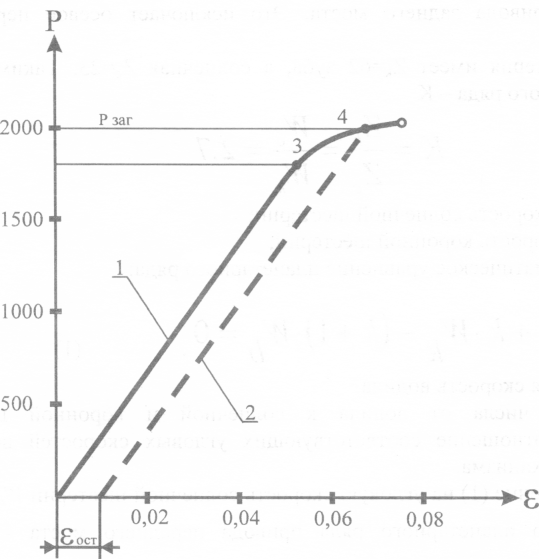 Рис. 15. Диаграмма нагружения болта при затяжке: 1 — линия нагружения, 2 — линия разгрузки, 3 — точка на диаграмме, соответствующая пределу упругости, 4 — точка нагружения болта при затяжке соединения, εост — остаточная деформация при разгрузке болта, Рзаг — усилие затяжки соединения
