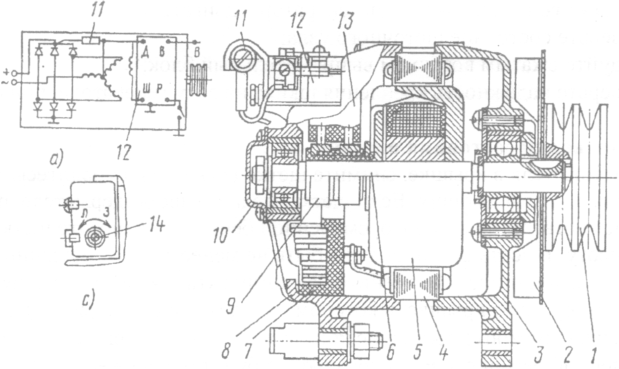 1 — шкив; 2 — вентилятор; 3 — крышка со стороны привода; 4 — статор; 5 — ротор; 6 — вал ротора; 7 — блок выпрямительный; 8 — крышка со стороны контактных колец; 9 — кольцо контактное; 10 — крышка подшипника; 11 — резистор подпиточный; 12 — регулятор напряжения Я120М; 13 — щеткодержатель; 14 — переключатель сезонной регулировки. а — электрическая схема; b — разрез; с — регулятор напряжения.