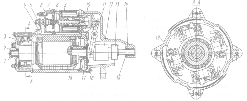 1- крышка со стороны коллектора; 2, 14, 17 — подшипники; 3 — траверза; 4 — перемычка; 5 — болт контактный; 6 — крышка реле; 7 — диск контактный; 8 — шток; 9 — ярмо реле с катушкой; 10 — крышка со стороны привода; 11- ось рычага; 12 — привод; 13 — шестерня привода; 15 — шайба упорная; 16 — шайбы замковые; 18 — катушки; 19 — щетка.