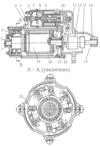 1 — крышка со стороны коллектора; 2,14,17 — подшипники; 3 — траверса; 4 — перемычка; 5 — болт контактный; 6 — крышка реле; 7 — диск контактный; 8 — шток; 9 — корпус реле с катушкой; 10 — крышка со стороны привода; 11 — ось рычага; 12 — привод; 13 — колесо зубчатое привода; 15 — шайба упорная; 16 — шайба замковая; 18 — катушки; 19 — якорь; 20 — щеткодержатель.