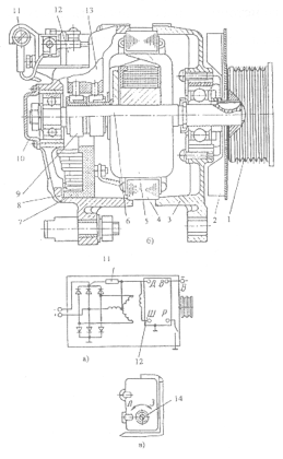 а) — электрическая схема; б) — разрез; в) — переключение напряжения «лето» — «зима»; 1 — шкив; 2 — вентилятор; 3 — крышка со стороны привода; 4 — статор; 5 — ротор; 6 — вал ротора; 7 — выпрямительный блок; 8 — крышка со стороны контактных колец; 9 — контактное лицо; 10 — крышка подшипника; 11 — подпиточный резистор; 12 — регулятор напряжения; 13 — щеткодержатель; 14 — винт посезонной регулировки.