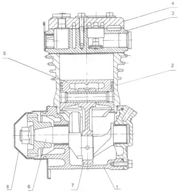 1 — картер; 2 — цилиндр; 3 — головка цилиндра; 4 — крышка; 5 — поршень; 6 — вал коленчатый; 7 — шатун; 8 — транспортная заглушка.